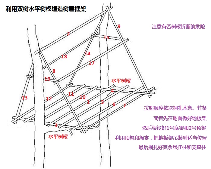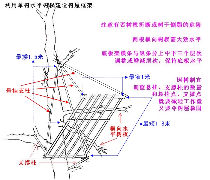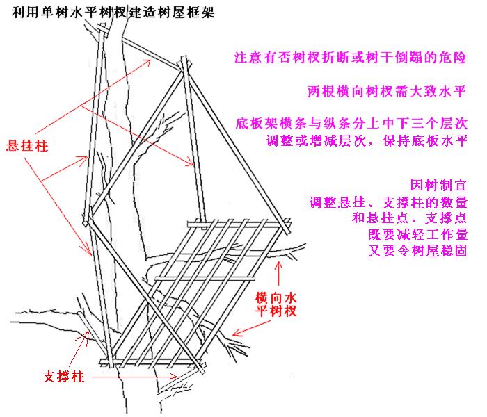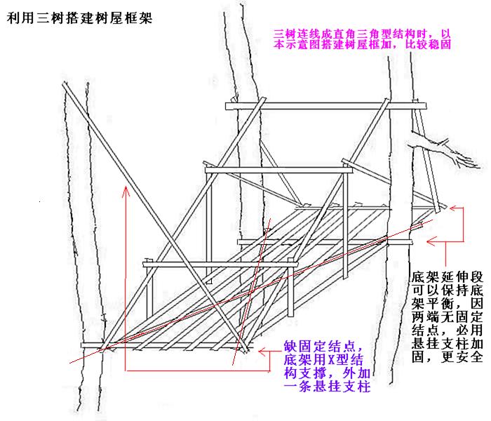 如果上下树杈足够高,就可以把树屋框架做成这个样子: