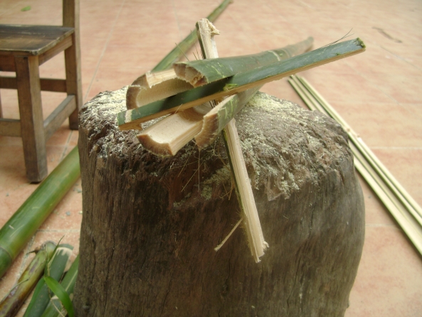 竹子干脆易折,但开裂性强,富有弹性和韧性,而且能编易织,坚固耐用,可以用它编织出很多种类的生活用具和劳作工具。 做顶棚架子只是它的应用之一而已。 根据棚面材料,可以适当调整竹篾之间的间距。 这是用竹制作茅草屋的顶棚架子的步骤哦: 第一步:选竹。选竹,竹子不宜太老,老则过硬,过嫩的话水分蒸发后成品会缩小,竹篾变脆。选竹要老嫩适中。 第二步:破竹。先劈开四分,呈十字状夹入两块竹片。如图:
