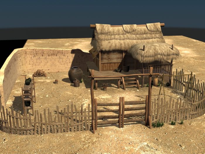 这是一款用石头做围墙的茅草棚屋,注意石头围墙的粘结材料用的是黄泥: