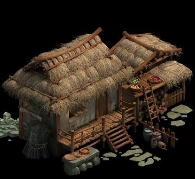 水屋、高脚屋、建造在水面上的茅草棚屋可以参照这种样子: 有围墙的茅草棚屋,没围墙,围栏也可以啊,超喜欢这种风格: