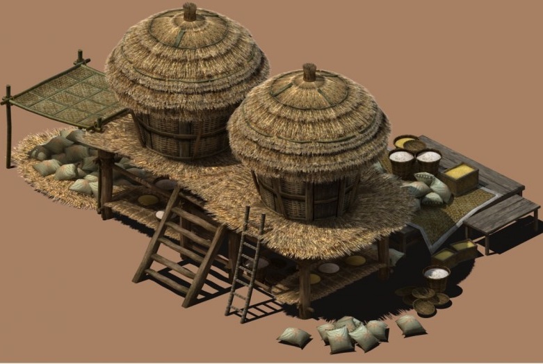 用来作粮仓的茅草棚屋,话说一个人能生产这么多粮食吗: