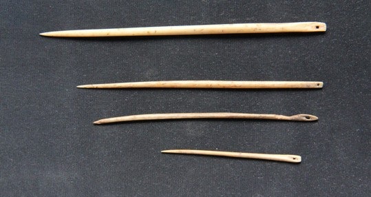 相比较而言,石针又粗又难制作,而木针因材料太软而易折,所以,如果可能,请尽量用骨头和竹枝制作针。针的制作过程基本一致: 1、选取坚硬细长的骨头、石头、竹子、树枝。 2、将细长的材料一端用粗糙的石块打磨成尖锐状,另一端打磨成扁平状。 3、用另一支尖锐的骨头或者打磨得很尖锐的石头,在扁平的一端小心地钻个细孔(实在无法钻孔就磨一条坑沟,反正能系住线就行)。 4、把半成品的针凉晒干燥,或用火微烤,即可使用。