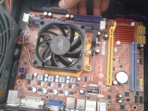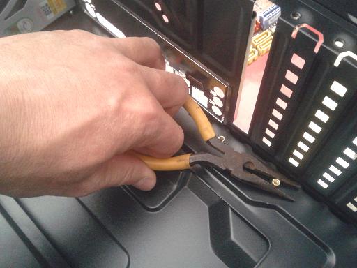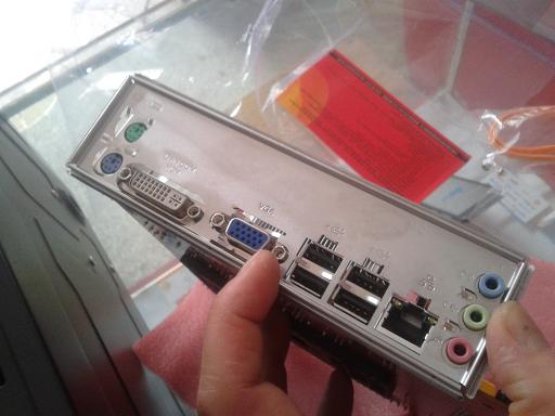 第十一步:看到了没,根据主板上接口的类型和数量,把小档板上应该开的口全部打开,再把小档板插到主板上去,看看有木有哪个应该开的口还没有开。这款四核套装主机所配置的梅捷主板,有传统的键盘和鼠标圆口、一个高清视频输出口、一个普通视频输出口、四个USB口、一个高/中/低网速适配接入口、三个音频输入/出口,接口齐全,能够满足家庭、办公和娱乐的需要。所以,千万一定要把小档板上该开的口全打开了。