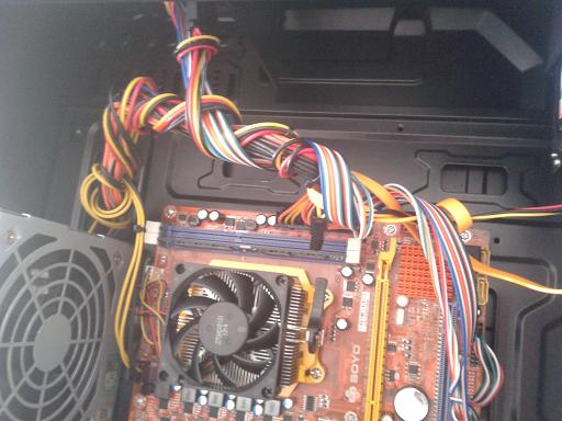 第二十三步:再检查一次接线是否正确,这一步要仔细哦。以下是安装好主板、CPU、内存条、硬盘、电源的主机内部情况: