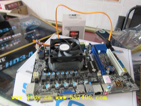 首先从盒子里取出cpu,对准针脚插在主板的cpu底座上,再压上卡扣条。 然后把cpu风扇压在cpu上,稍稍转动几下,让散热器紧贴于cpu上,再对准风扇卡扣口,压紧风扇。 这个第一步说起易,做来也易,但对于新手来说,还是要多看看,少动手为妙,要不几百块的cpu说没就没了 装好cpu的主板是这个样子的,个人学得还是INTEL的cpu好装一点。