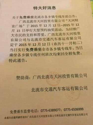 新圩到北流公交车来回全程免费! 十年一遇,仅此一天:2015年12月12日!!!