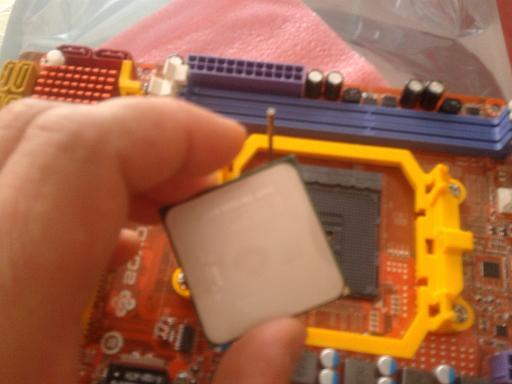 第二步:拿CPU对准主板上的CPU底座,安装CPU。注意了,CPU和其底座只有一个方向是可以对准插上去的,如果对不准就插上去,来个霸王硬上弓,那可会精尽人亡,哦不,是CPU会立即损坏~~~ | |