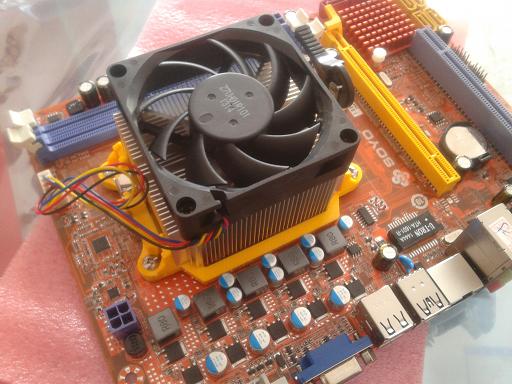 第四步:安装CPU风扇。AMD类型的比较好安装,INTEL类型的有点麻烦。记得插上风扇的电源线,要对准这个电源线的插座哦,要不又一次精尽人亡~~~~~~~~~