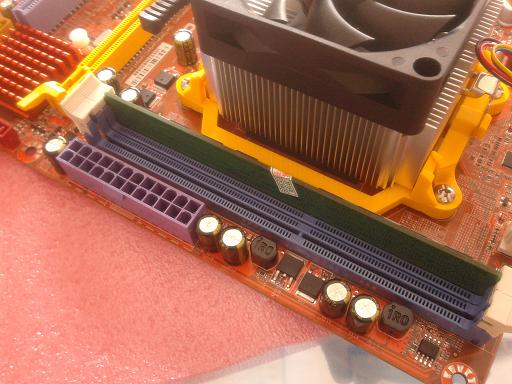 第五步:插好内存条。这是一根4G的金士顿内存条,频率为1600,两百多大洋哦,刚刚拿的新货,绝对保证一年内有损坏就立即更换全新的给客户!!!而主板上的内存条插座跟这个内存条也是绝配的,但要对准卡口对能插,否则~~~~~~~~