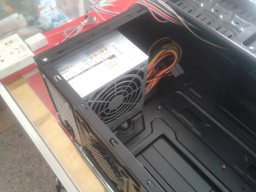 第八步:安装电源。为什么要先安装电源?本店工作人员认为,电源比较粗重,应先安装好。这方面客户什么都不懂,但出于稳定性考虑,我们给他配置了一个价值180元的、适合四核CPU供电的长城电源,而不是胡弄一个网上被吹得天花乱坠实际价值只是七八十块的普通杂牌电源。