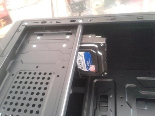 第九步:安装硬盘。为什么安装好电源后接着就要安装硬盘呢?佳通电信工作人员说,因为硬盘比较轻,好安装~~~~~~我靠,这理由听起来比较怪怪地。。。。。。这南谷机箱有多个硬盘位,应该选一下比较靠近底部的位置,这样可以方便以后布线。